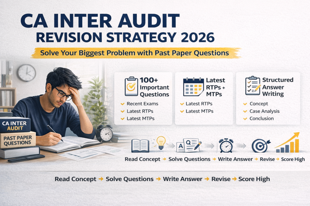 11 Apr Blog CA Inter Audit Revision Strategy 2026: Solve Your Biggest Problem with Past Paper Questions April 11, 2026 Featured By AuditguruMasteradmin Facebook Twitter Pinterest linkedin Telegram If you are preparing for CA Inter Audit, one problem is common across most students—they are not able to score we...Continue reading