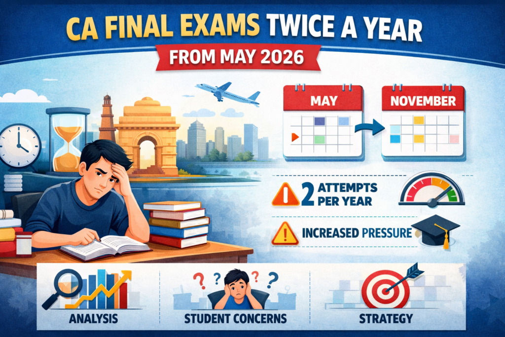 09 Apr Blog CA Final Exams Twice a Year from May 2026: Complete Analysis, Student Concerns, and Strategy April 9, 2026 By AuditguruMasteradmin Facebook Twitter Pinterest linkedin Telegram The Institute of Chartered Accountants of India has officially announced a significant change in the CA Final exa...Continue reading