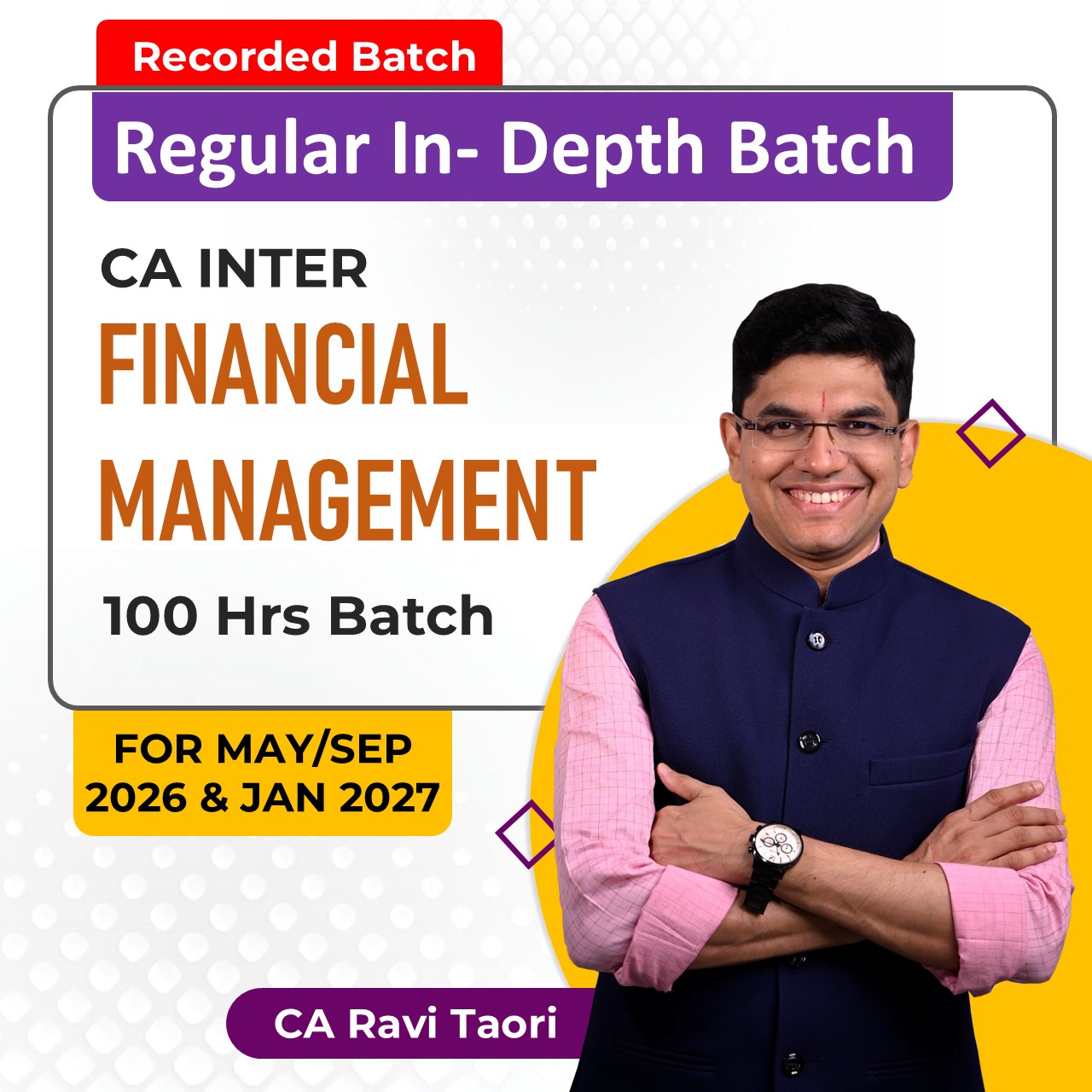 2. 100% syllabus coverage as per the ICAI module 3. Unlimited Validity 4. Approx 50 lectures @ 100 hrs for total syllabus completion 5. Handwritten Notes. 6. Daily audio revision Useful For: a. Useful for students studying this subject first time after foundation b. All direct entry students from B Com or from any other stream |